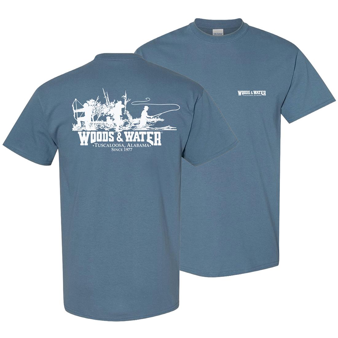 Features the Woods & Water Single Color Trio design on back; and the Woods & Water name on front left chest.