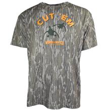 Mossy Oak Washed Out Bottomland and Shadow Grass SS Tee with the Cut ' Em design on front in larger print, and the Woods & Water Logo in smaller print also featured on the front.