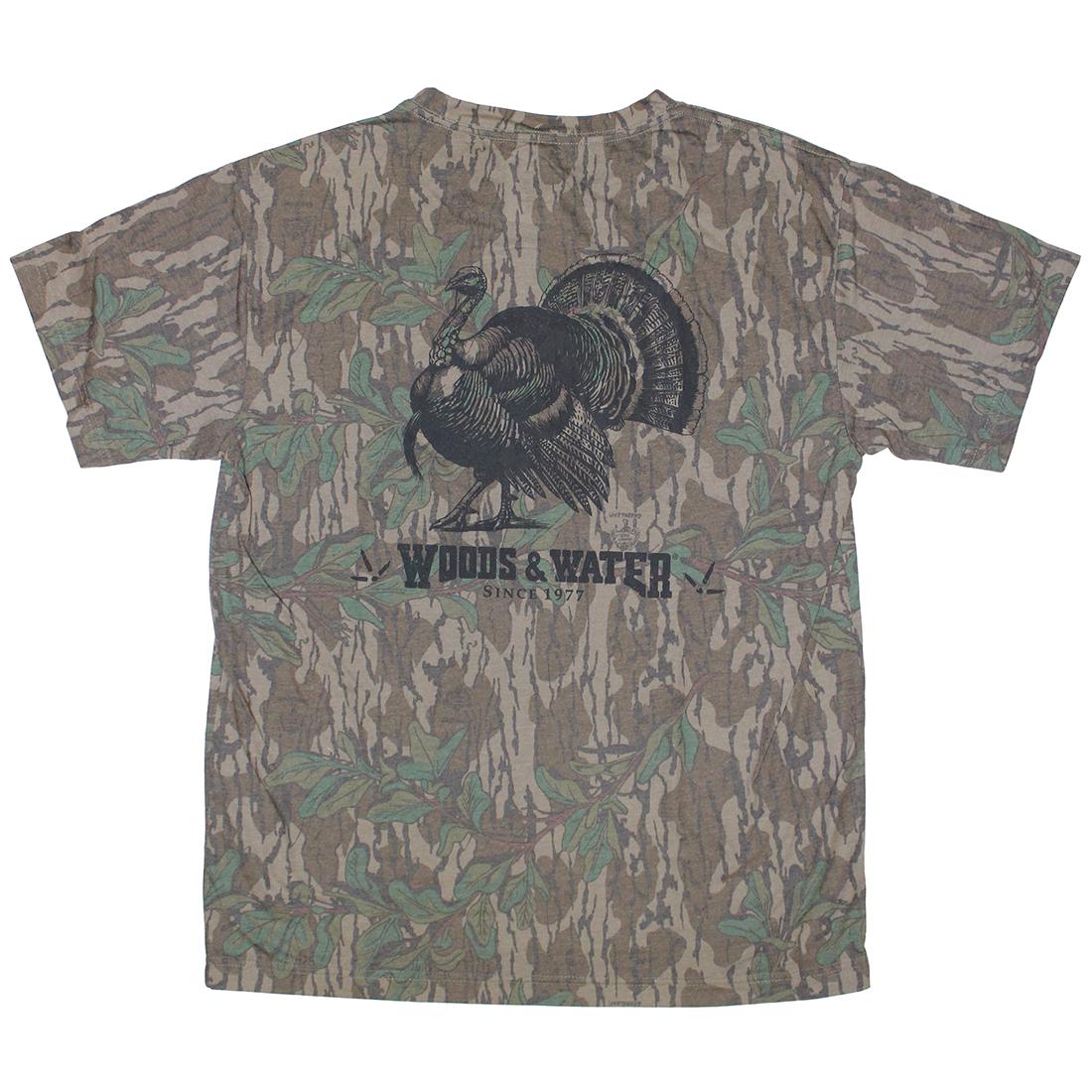 Woods & Water Tee with Turkey Strutting on back and Woods & Water logo on left chest.