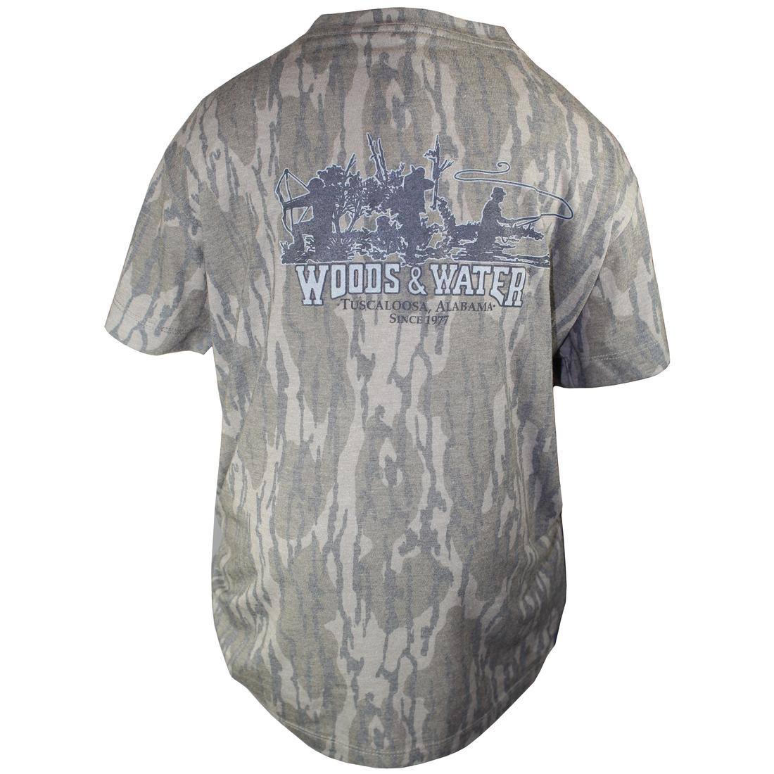 Woods & Water Tee with Trio logo on back and Woods & Water logo on left chest.