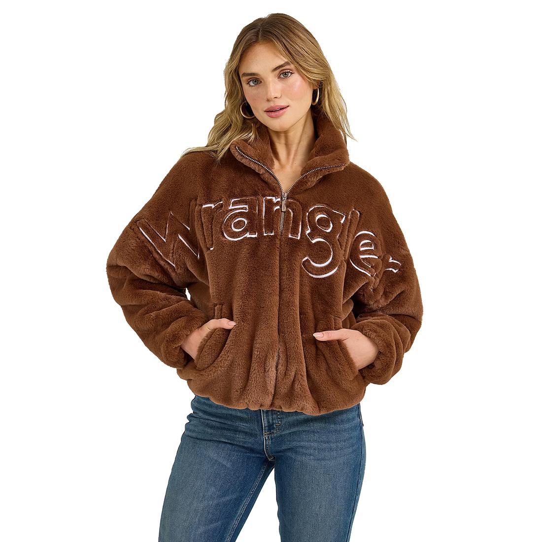 When colder weather arrives, the Women's Wrangler Retro® Logo Fuzzy Zip Jacket will surround you in comfort. It’s crafted for softness and warmth, so you can bundle up without losing that cowgirl flair you love. It comes with a roomy fit, dropped shoulders, a slightly cropped silhouette, and a full zip closure for easy layering. Plus, you’ll have the Wrangler® logo across the chest to keep any outfit grounded in Western authenticity.
