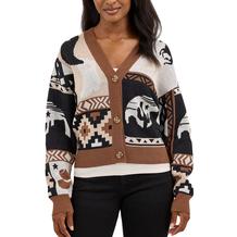 Bundle up in classic cowgirl style with our Western Cropped Cardigan. Right on cue for cooler days, this sweater is crafted for softness to keep you cozy all the way until springtime. This layering piece comes with a retro-inspired print in neutral tones, three buttons, chunky ribbed trim, and a subtly oversized silhouette that you can easily toss over tanks or tees.