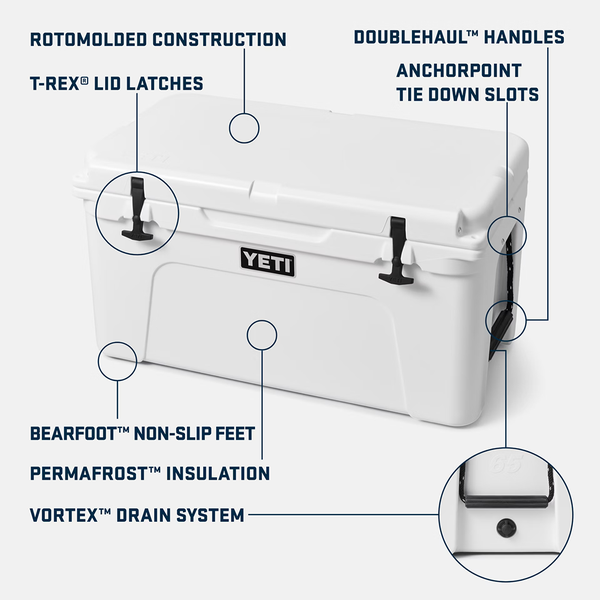 KEEPS A CAMPING WEEKEND FOR FOUR, MOONLIGHTS AS A CASTING PLATFORM, AND HOLDS THE COLD ON TRIPLE-DIGIT DAYS. The Tundra® 65 Cooler is Yeti's most versatile cooler, just as adept at keeping your catches cold in the field as it is storing the drinks and food for your backyard barbecue. It feels right at home on the dock, at the ranch, and in the blind. Plus, this ice chest offers up plenty of room for your limit of redfish or your prized brisket without breaking a sweat.